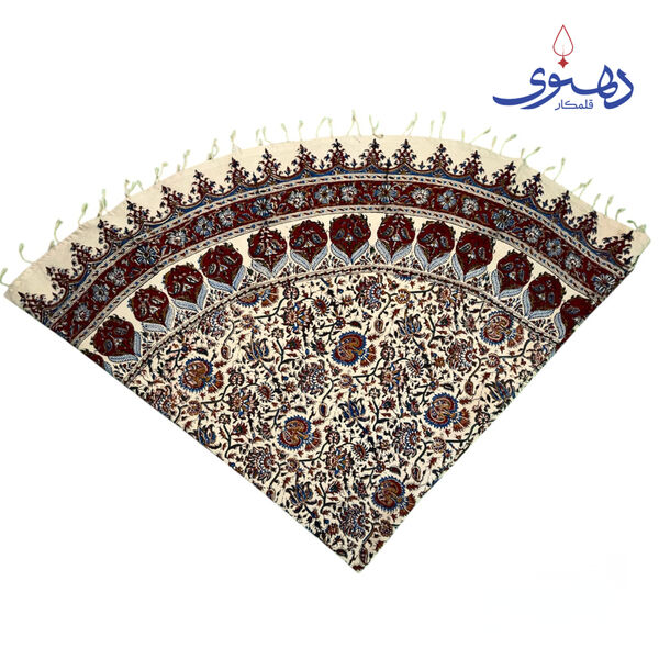 این سفره قلمکار گرد سنتی با قطر بزرگ‌تر، انتخابی فاخر برای میزهای گرد شش نفره در پذیرایی‌های صمیمی و مراسم‌ سنتی است. نقوش کلاسیک چاپ‌شده با مهرهای چوبی و رنگ‌های گیاهی، جلوه‌ای هماهنگ و چشم‌نواز بر پارچه پنبه‌ای اعلا ایجاد کرده‌اند—گویی قطعه‌ای از نگارگری ایرانی در مرکز خانه جای گرفته. فرم دایره‌ای، نمادی از پیوستگی و برابری در حضور عزیزان، چیدمانی گرم و فرهنگی را رقم می‌زند.