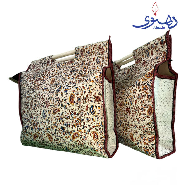 این کیف قلمکار با پارچهی چاپ دستی و دستههای چوبی طبیعی، ترکیبی بینظیر از هنر ایرانی و عملکرد روزمره را ارائه میدهد. نقوش سنتی بتهجقه، ترنج یا اسلیمی با مهر چوبی و رنگهای گیاهی روی پارچهی پنبهای اعلا نقش بستهاند تا جلوهای فرهنگی، بادوام و چشمنواز ایجاد کنند. دستههای چوبی پرداختشده، حس گرم صنایعدستی را در دستان شما زنده میکنند و حمل کیف را راحتتر و شیکتر میسازند.